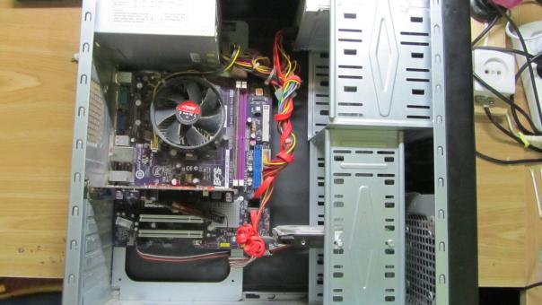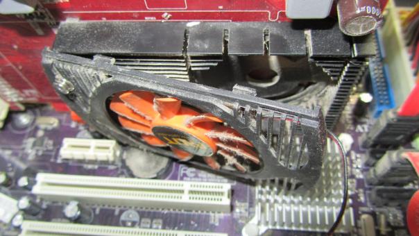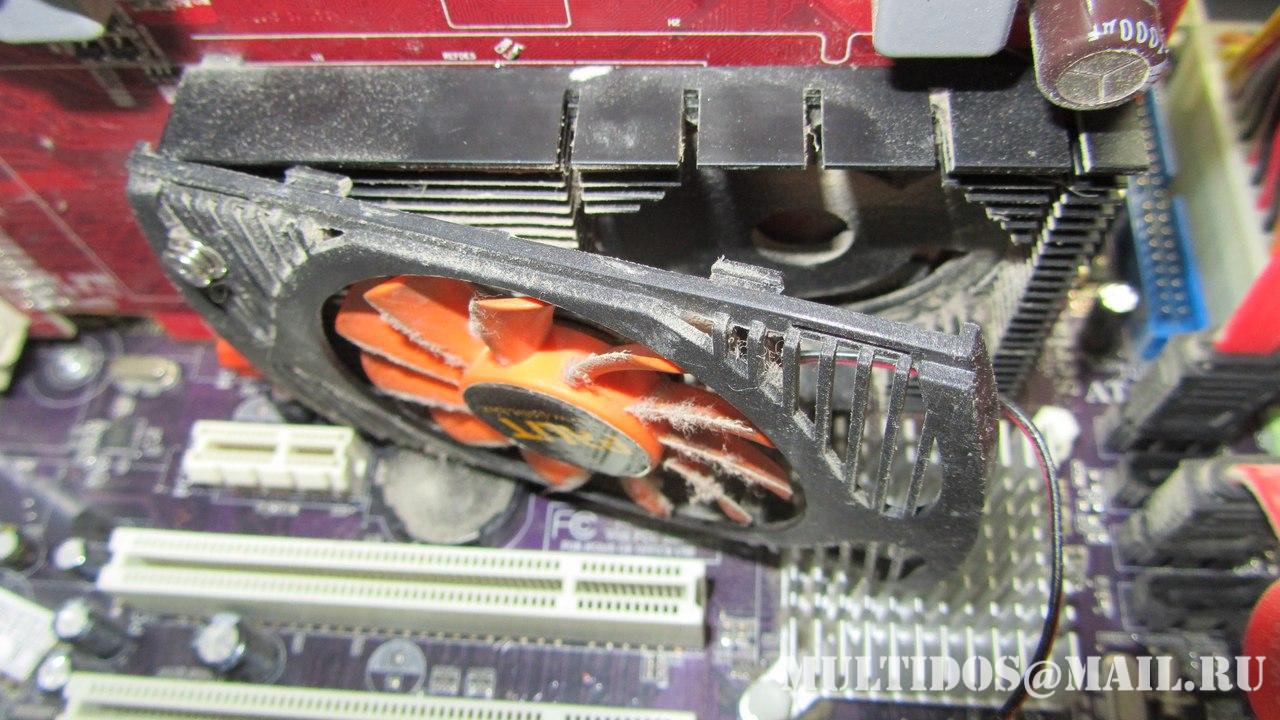 Сняв боковую стенку системного блока, причина странного поведения компьютера стала сразу понятна. Кулер видеокарты был установлен неродной и висел в воздухе... О охлаждении видеокарты не могло быть и речи...