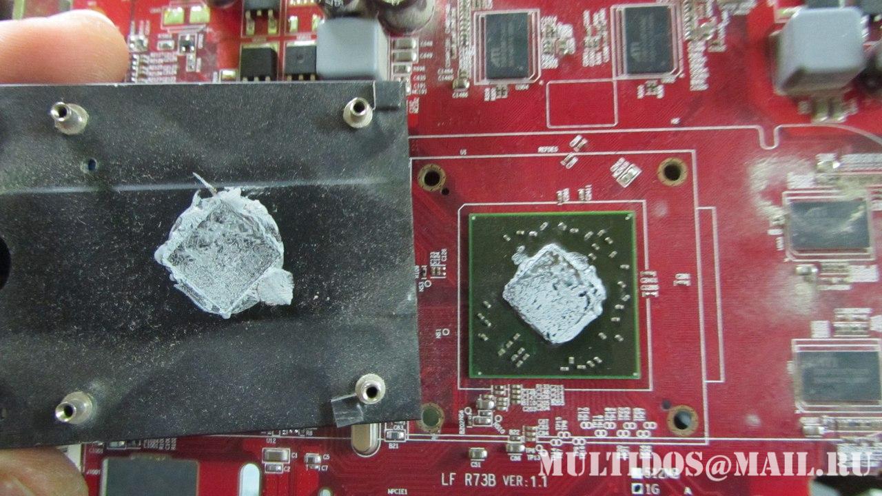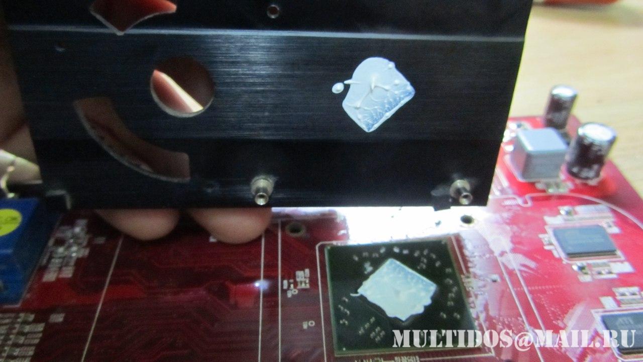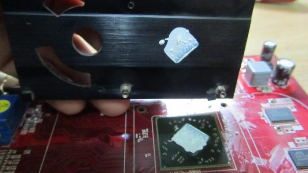 После нанесения свежей термопасты и попытке установить радиатор на место стало понятно что сделать это не возможно. Радиатор был явно не от этой карты и при установке упирался в кварцевый резонатор, тем самым не давая радиатору равномерно прижаться к кристаллу (на фото ниже видно как криво распределилась свежая термопаста на отпечатке радиатора от кристалла). Итого: в данной видеокарте не родной кулер и радиатор.. сборная солянка из трех видеокарт =)