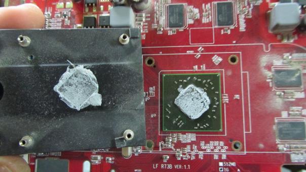Вынув видеокарту и отчистив всё от пыли было решено заменить термопасту и сам кулер... Сняв радиатор с кристалла видеочипа был обнаружен чей-то отпечаток пальца =)