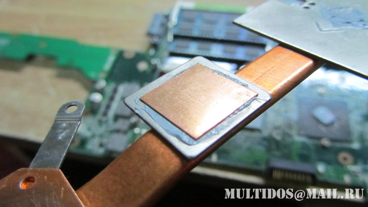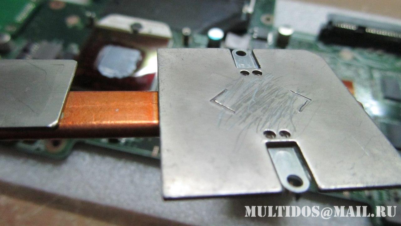 Ноутбук пришел в печальном состоянии после "мастера-чистильщика" который почистил ноутбук от пыли... Защелки разъемов сенсора и клавиатуры были сломаны, а самым печальным оказалось то, что терморезина северного моста была заменена на термопрокладку (обычно такие ставят на отвод тепла от транзисторов) обильно смазанную с двух сторон термопастой =))) Также на самом радиаторе были не хилые царапины, старую термопасту с него по всей видимости соскребали ножом! Результат такой профилактики - дохлый север!