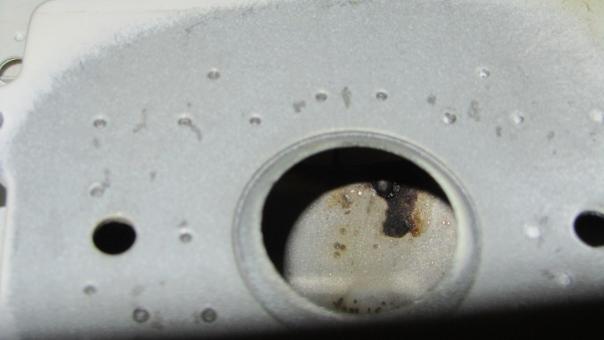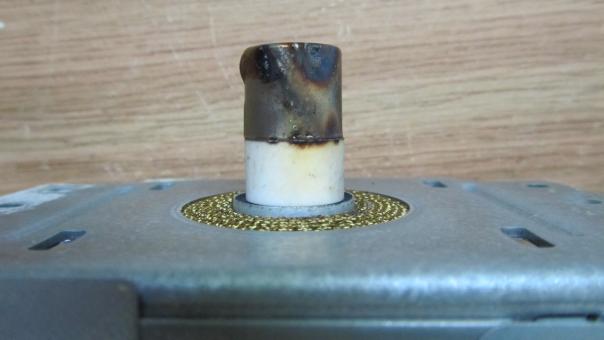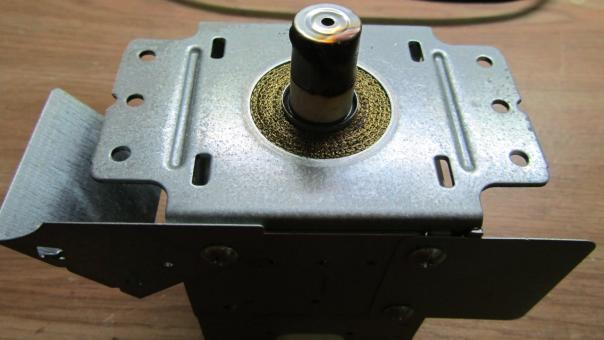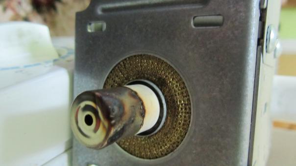 Разбираем микроволновку, снимаем магнетрон, предварительно открутив 4 винта его крепления и смотрим на всю эту красотень... Осторожно внутри микроволновки стоит конденсатор, заряжается он до 2000 вольт и долго хранит в себе накопленный заряд, так что разъем с магнетрона вытаскиваем предельно осторожно стараясь не касаться оголенных контактов. Видно что весь волновод магнетрона залит жиром, видны следы пробоя... Аккуратно чистим всё, сам волновод и места пробоя оттираем в конце спиртом... Прогары на защитной пластмассе аккуратно срезаем что бы там было всё чисто без следов угля =) Собираем всё в обратной последовательности и радуемся вновь исправной печи.