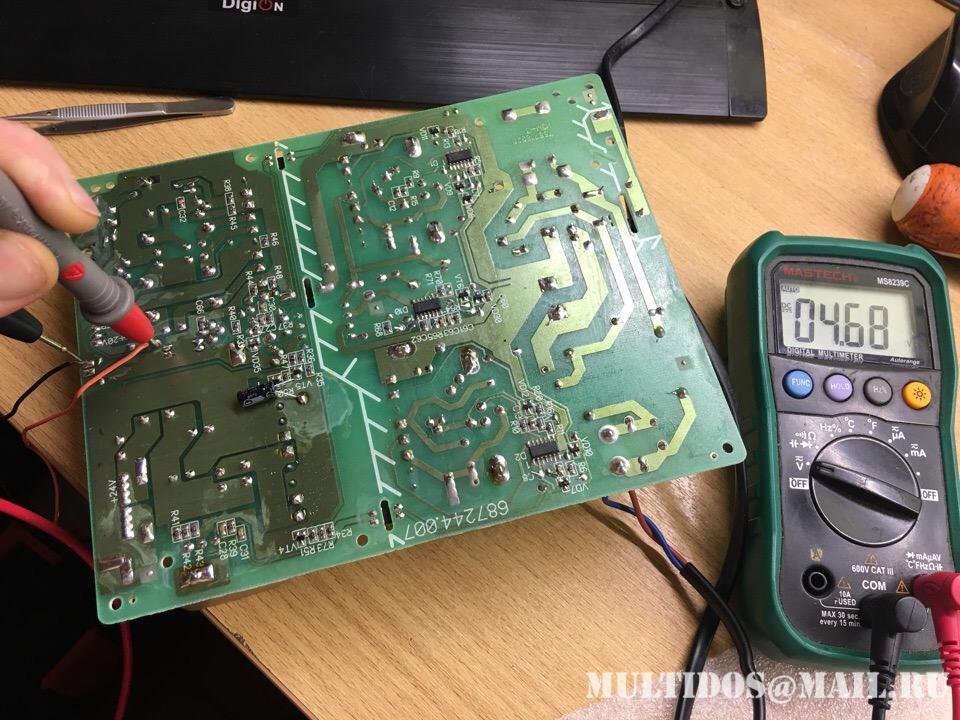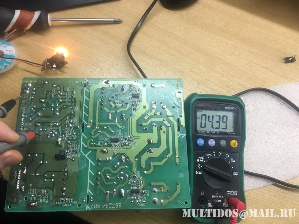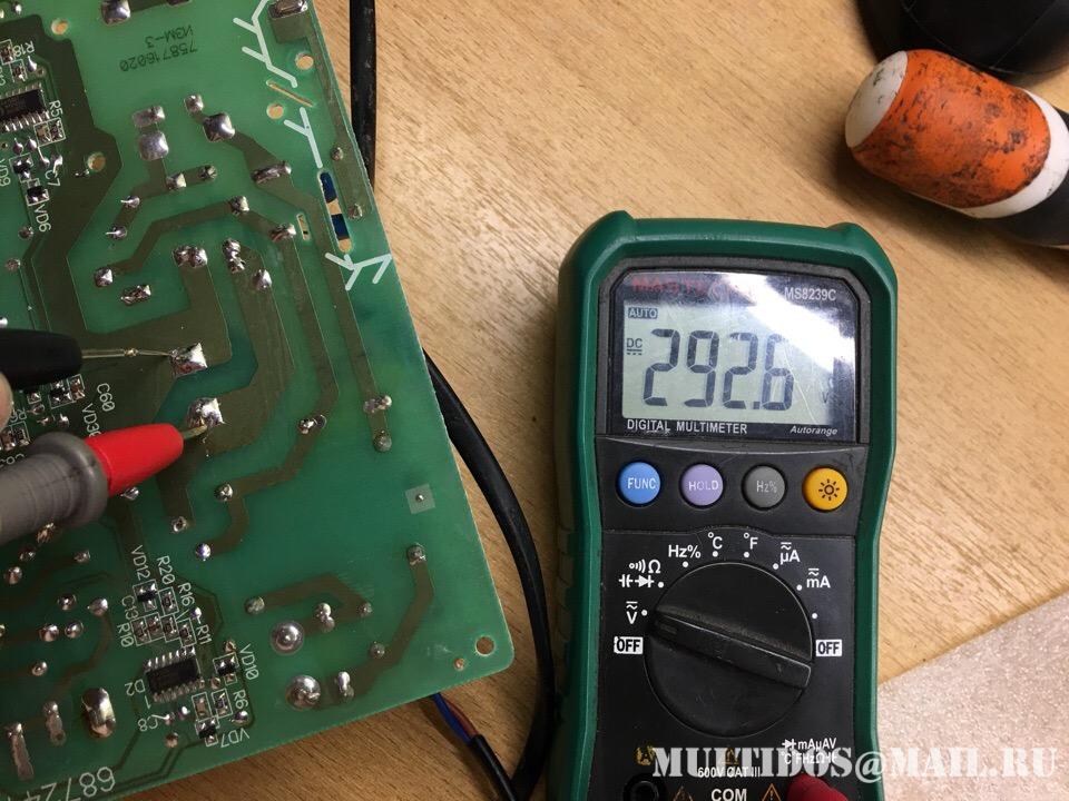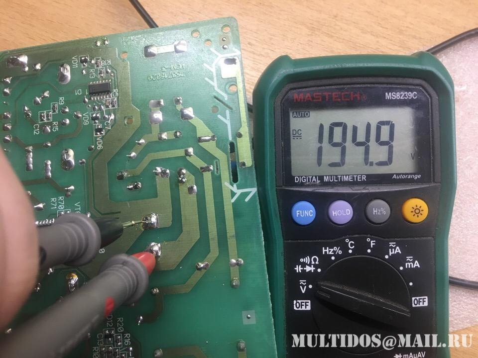 Затем нагружаем первичку лампой и включаем блок в сеть ограничив ток. Проведя изменения напряжений стало ясно что неисправен сетевая банка, так как напряжение на ней было всего 194,9 вольта, а должно быть в любом случаи выше 220, а точнее 220*(корень из 2х) :) ну или проще амплитудное значение... получаем что-то около 310 вольт, но никак не 194,9!