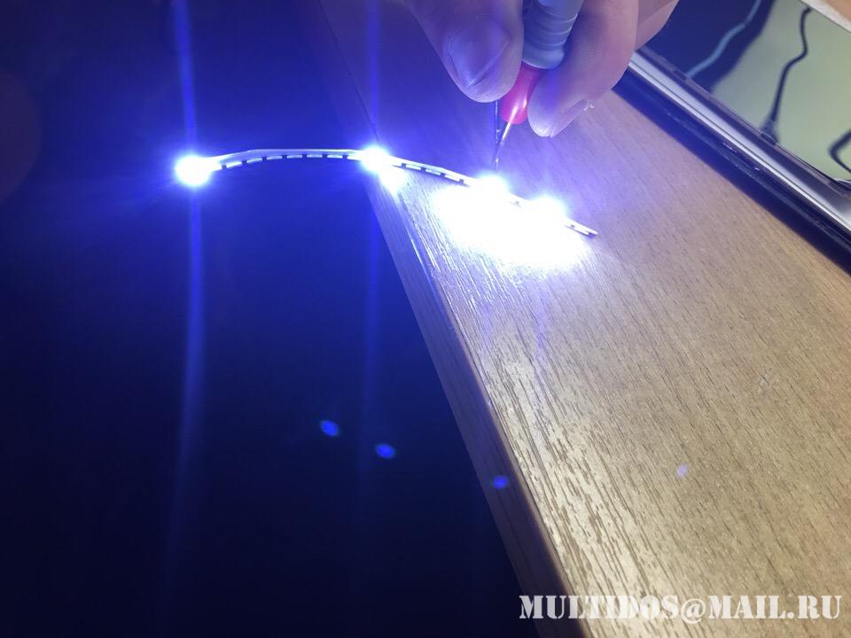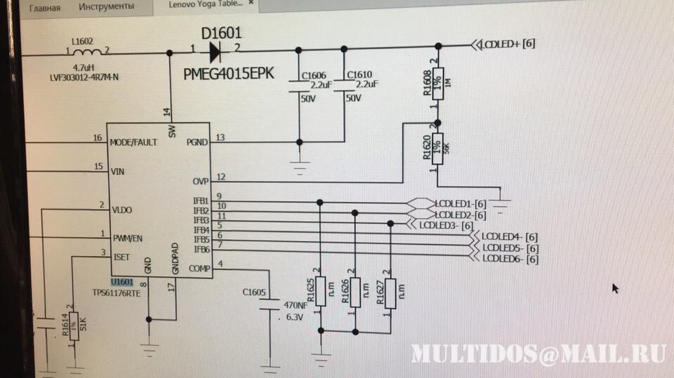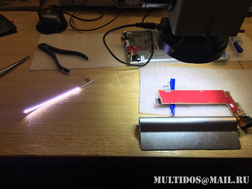 Планшет с данной неисправностью оказался на ремонте, подсветка дисплея вспыхивает и гаснет! При этом если подключить LED тестер к подсветке дисплея она начинала светиться, что и привело меня в некоторое замешательство. Но осциллограф и линейка подсветки вынутая из битого дисплея поставили все на свои места! Единственное что осталось загадкой - это то что драйвер по схеме подключается тремя отдельными катодами, а линейка в самом дисплее имеет всего 1 катод! Линейку с битого дисплея я подключал по 3ем отдельным катодам. Жаль что распаковать дисплей удачно не удалось, но даже неудачный опыт - это тоже опыт ;) Посвящается всем тем кто столкнется с данной неисправностью и не будет знать как работает подсветка и как проклеен дисплей со стороны лент подсветки ;)
