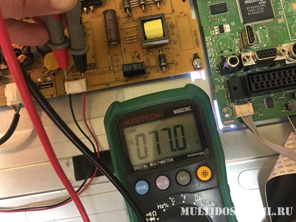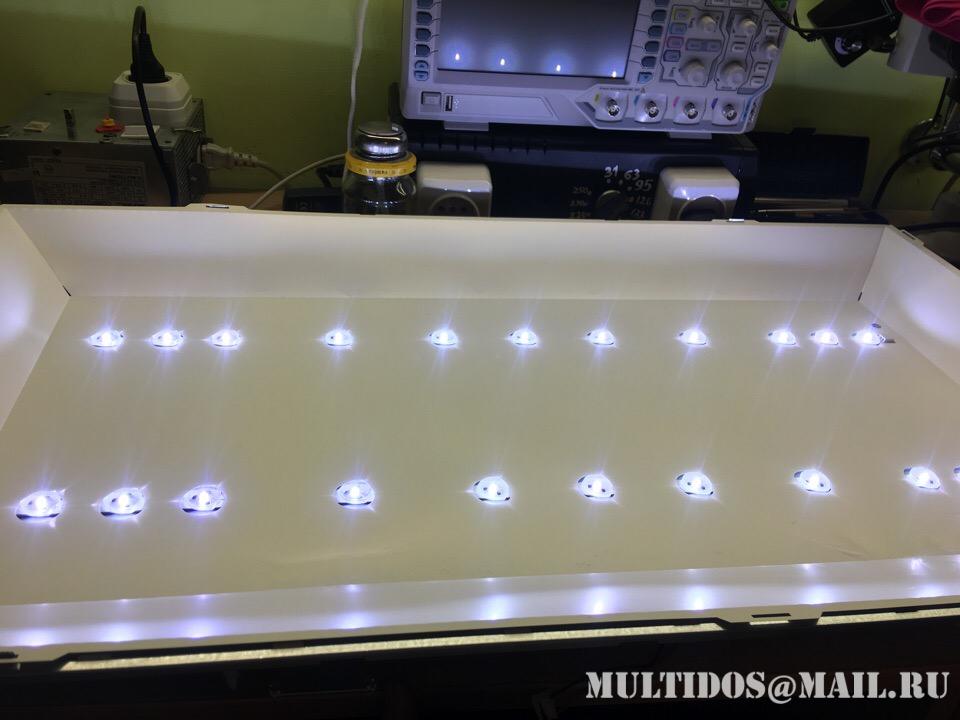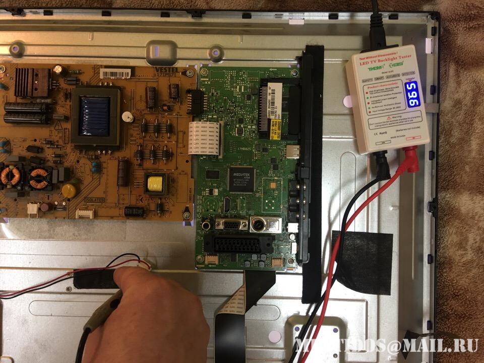 LED-тестер зажег подсветку, а вот схемный драйвер уже на отрез отказывался запускать подсветку и причиной тому стали 2 сгоревших диода в ленте. Фото кишок с напряжениями прилагаю ;) как видно что до ремонта, что после led-тестер подаёт одинаковое напряжение на диоды. И это в определенной степени может завести в заблуждение о исправности подсветки при диагностике. Всем удачи!